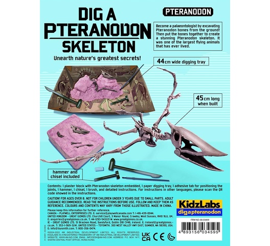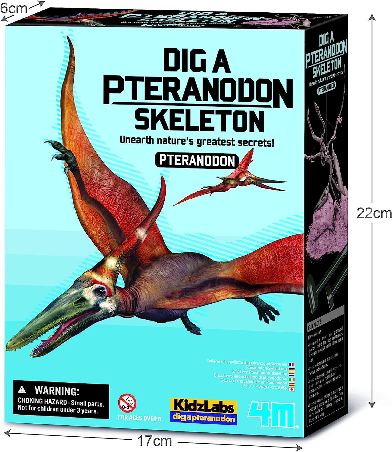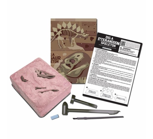 Become a paleontologist and experience the thrill of a real dinosaur dig with this hands-on science kit. Dig through a plaster block to find the bones of a Pteranodon, then assemble them into a cool skeleton model. This kit contains everything needed to excavate the model skeleton from the block. Once the bones are unearthed, you can assemble the pieces to create a Pteranodon skeleton and display it on the included stand. This kit is a great way to introduce children to the world of paleontology and archaeology in a fun and engaging way.