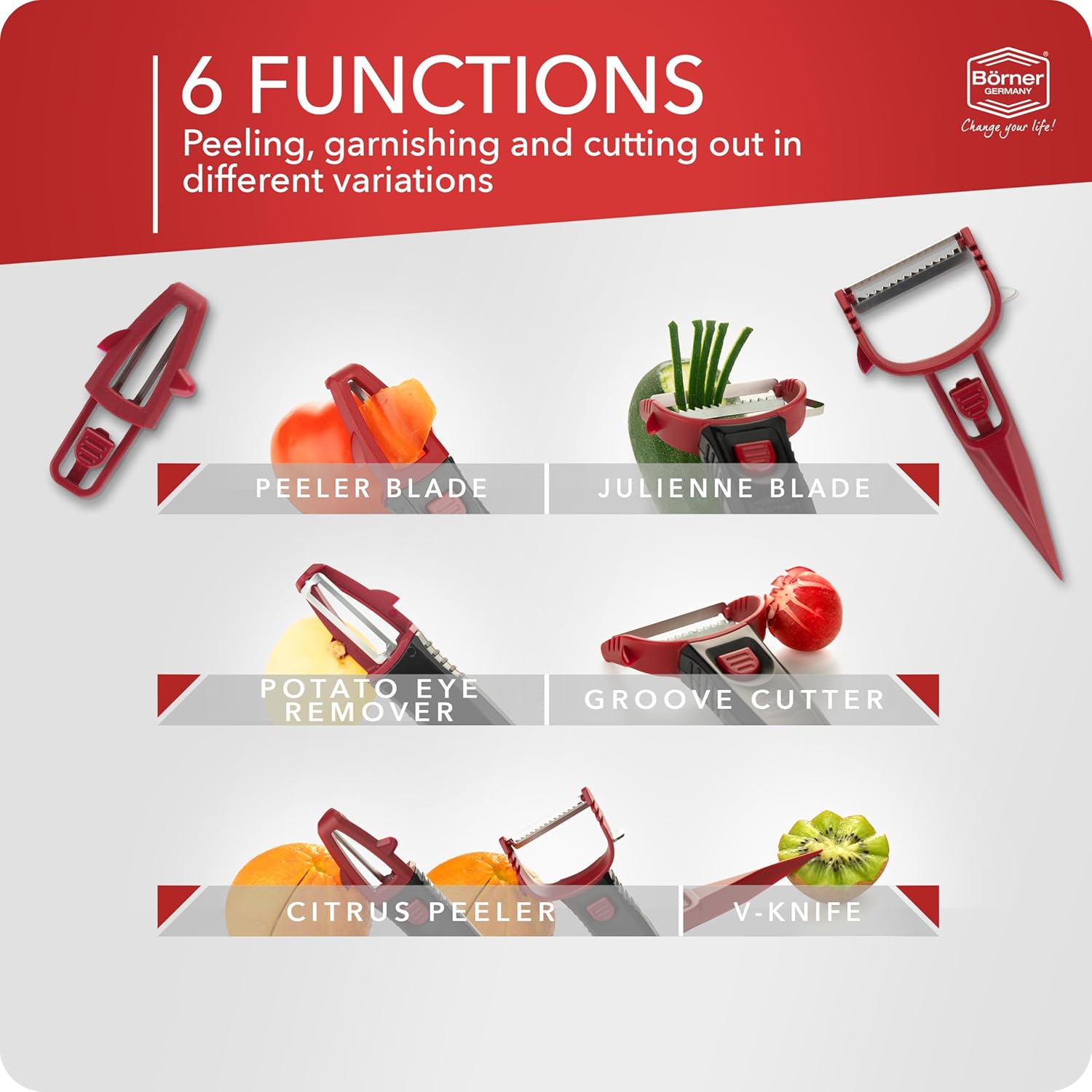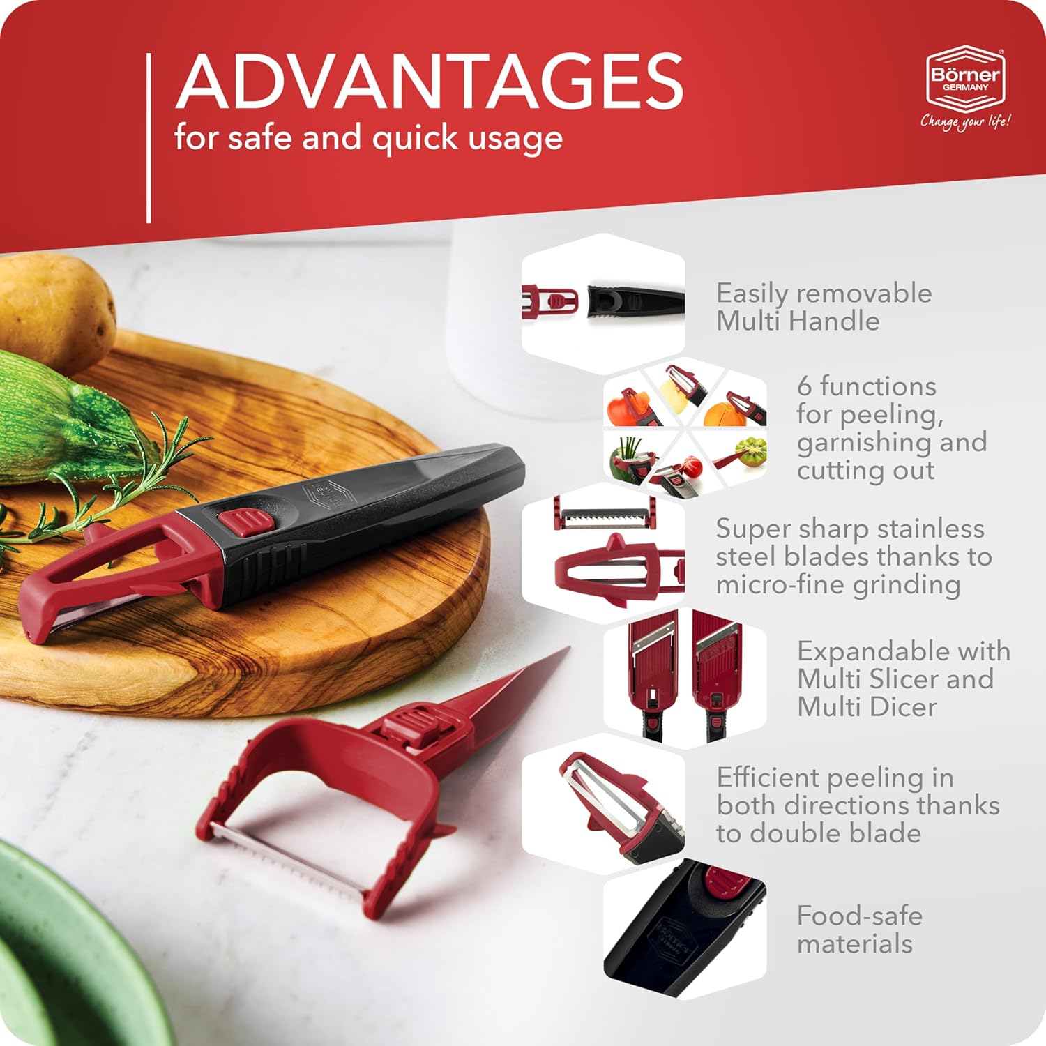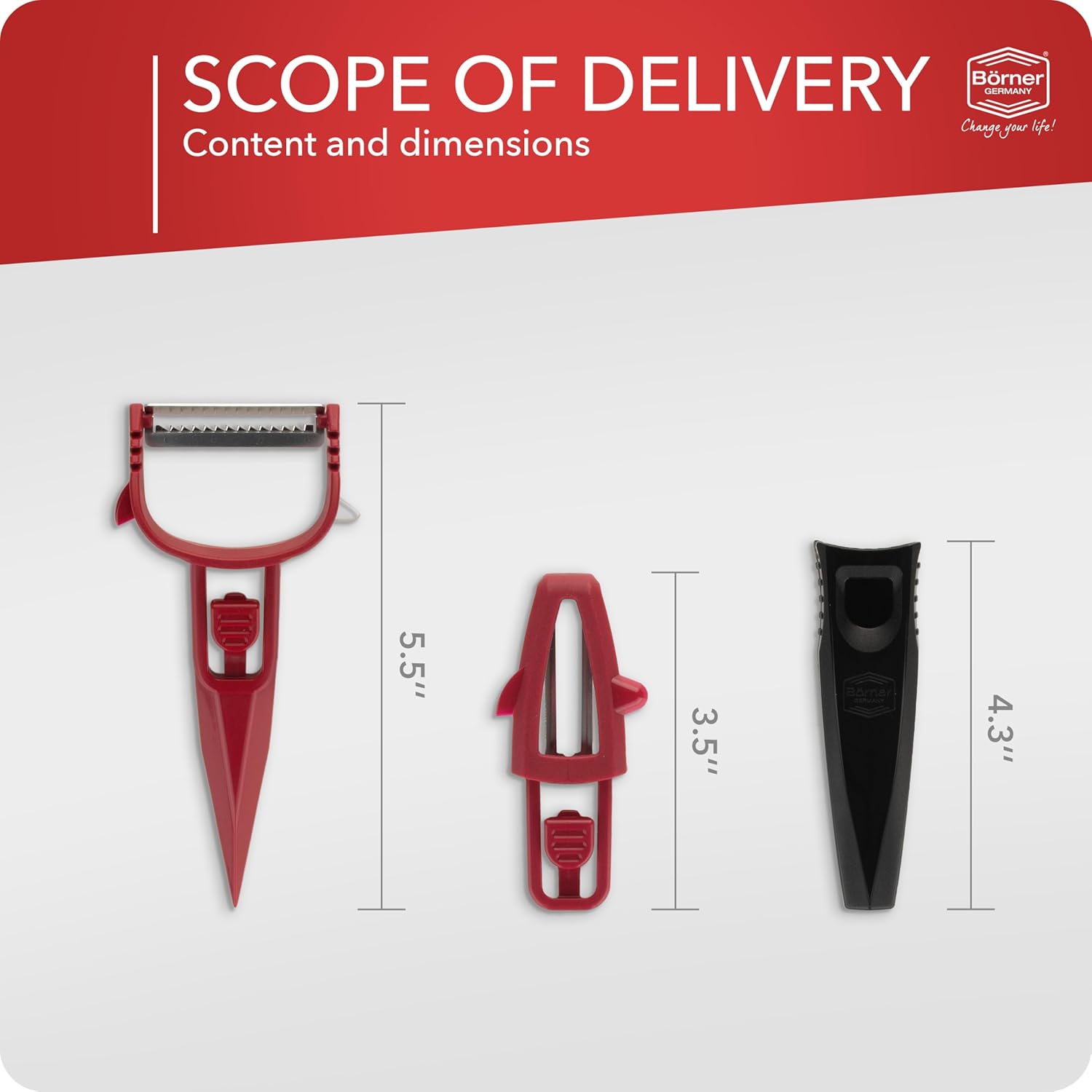 Börner Multi Peeler 3-Piece Set – Peeler & Julienne Cutter – Red & Black