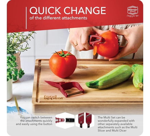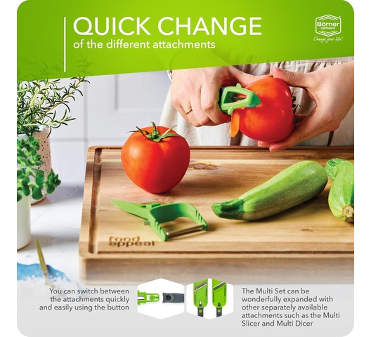 The Börner Multi Peeler 3-Piece Set is a practical, space-saving tool that adapts to various peeling and slicing needs. The interchangeable attachments allow you to switch easily between a stick peeler and a julienne cutter, providing versatility for preparing and garnishing food. You get a reliable product that will last for years while keeping your kitchen organized.