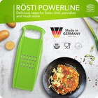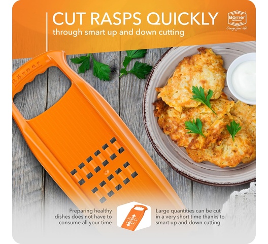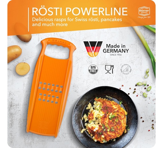 The Börner Rösti PowerLine grater is the perfect tool for quickly and easily preparing authentic Swiss Rösti and potato pancakes. It produces perfectly grated cheese and fine strips of potatoes or vegetables, making it simple to create unique dishes that family and friends will love. This grater is designed for use with a safety fruit holder, allowing you to process ingredients down to the last piece.
