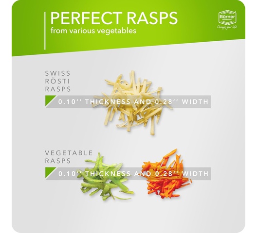 | Specific Uses | Perfect for preparing fine strips of cheese or potatoes for Swiss Rösti and potato pancakes. Creates shredded vegetables |