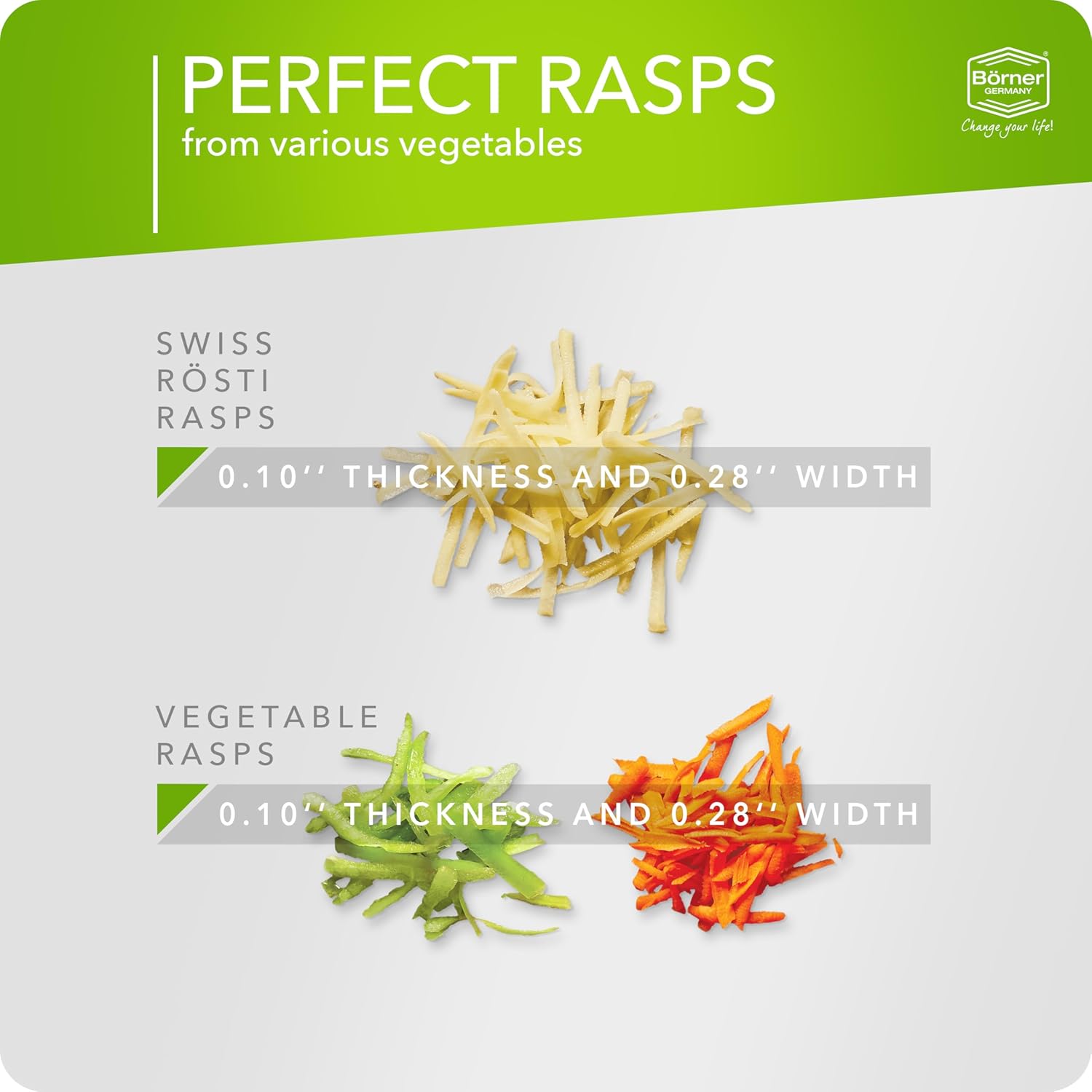 Specialised Grating – Perfect for preparing fine, uniform strips of cheese or potatoes for delicious Swiss Rösti and potato pancakes.