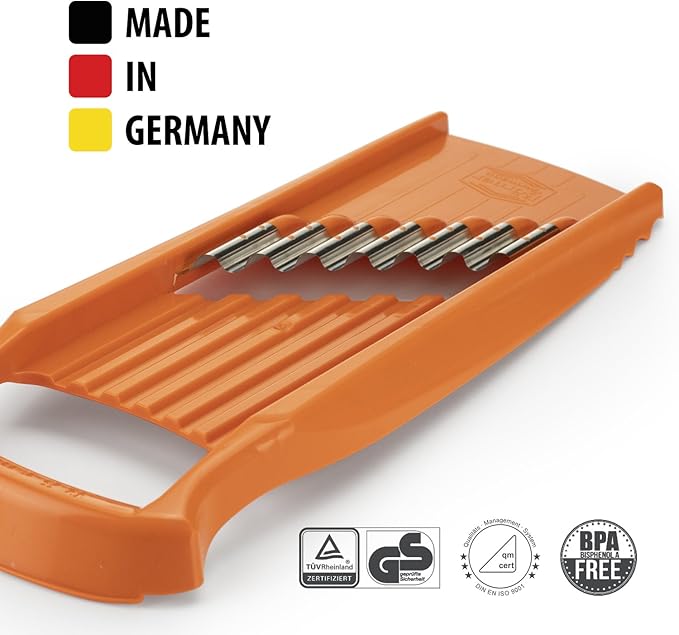 The Börner Wave-Waffle Cutter PowerLine creates unique wavy and waffle cuts in three thicknesses, adding variety and fun to any meal. It is perfect for making homemade potato waffles, healthy vegetable snacks, or impressive garnishes. The integrated child safety lock offers secure storage, and the design allows for making even spiral pasta for creative cooking.