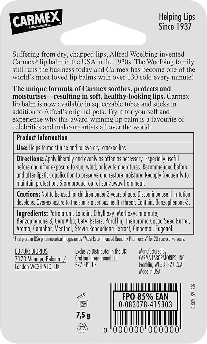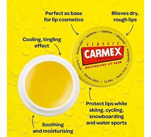 The Carmex Pot (7.5 g) is the classic Carmex formula in a small pot format. Designed for those wanting heavy coverage or the ability to use with fingers for thicker application, especially helpful overnight or for lips that need deeper repair.