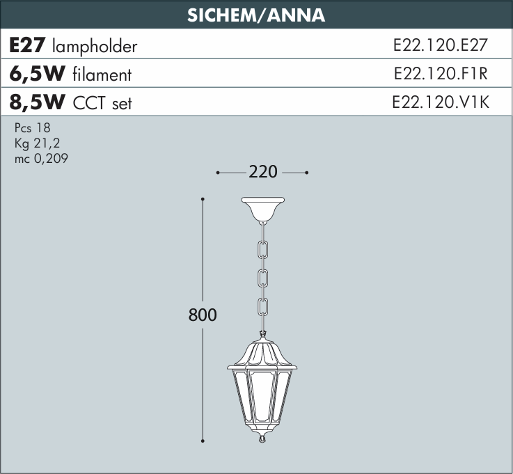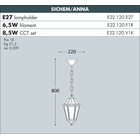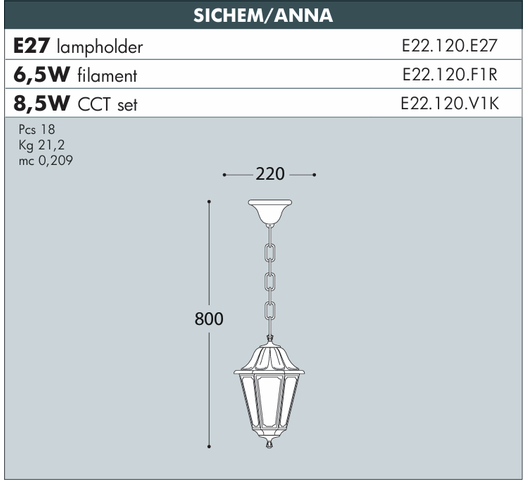 What's included | 1 x Hexagonal Anna lantern head. 1 x Sichem hanging chain and ceiling rose/canopy for mounting. 1 x E27 lampholder. Necessary fixtures and fittings for ceiling mounting. 1 x Gaskets for sealing. |