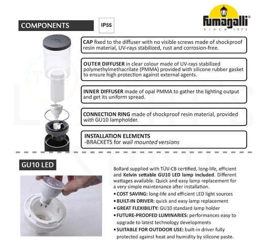 Care & Maintenance | Made from shockproof resin material, UV-rays stabilized, rust and corrosion-free. Designed to resist discolouration or fading, requiring no painting or specific maintenance. Features quick and easy lamp replacement due to the standard GU10 holder. |