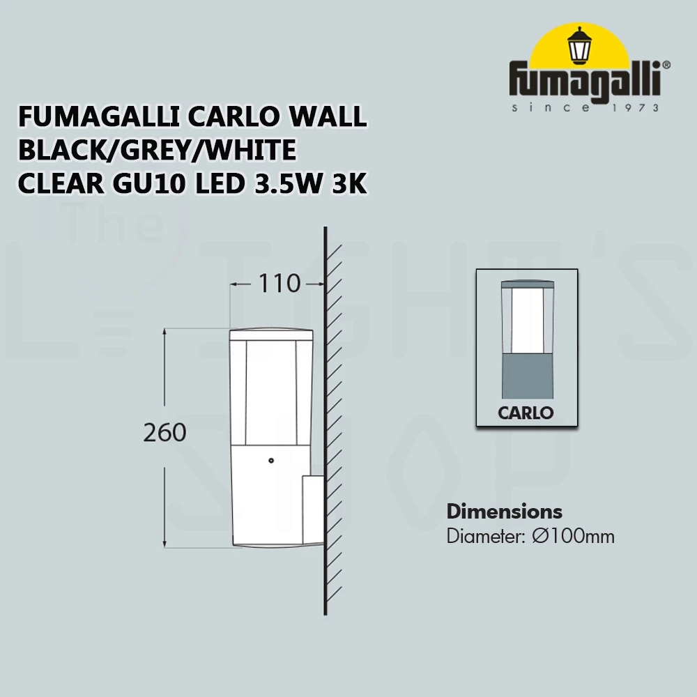 The Fumagalli Carlo Contemporary Design Wall Light is a sleek and modern outdoor lighting solution, designed to enhance the aesthetics and functionality of your exterior spaces. Made in Italy, this wall light is crafted from high-quality, shockproof resin that is UV stabilized and resistant to rust and corrosion. It features a double PMMA diffuser, providing efficient and uniform illumination. The light is equipped with a GU10 LED bulb with adjustable Kelvin settings, ensuring energy efficiency and long-lasting performance. The Carlo Wall Light is TÜV-CB certified, guaranteeing high quality and durability.
