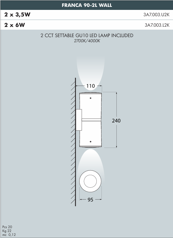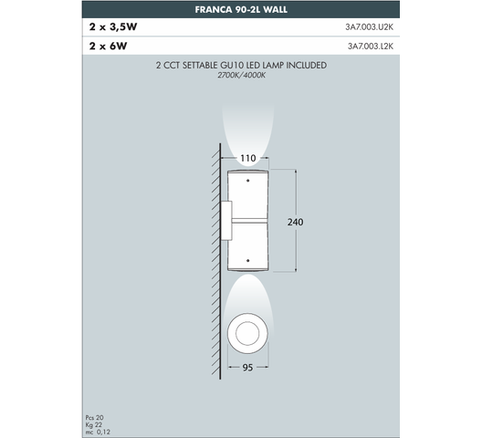 What's included | 1 x Franca 90-2L wall light unit (body, two diffusers, two GU10 lampholders, silicone gaskets) |