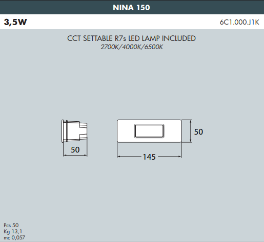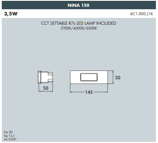 Net Weight (Kg) | Nina 150: 0.3; Nina 190: 0.72 |