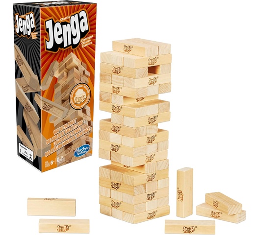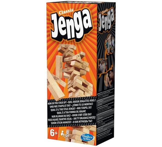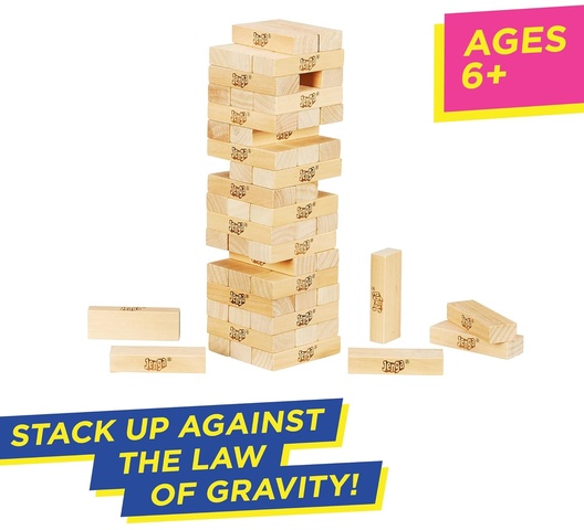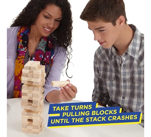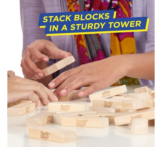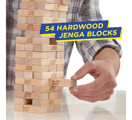 It's the classic Jenga game with genuine hardwood blocks. The game is a classic block-stacking, tower-tumbling game that requires skill, strategy, and a bit of luck. Pull out a block, place it on top, and don't let the tower crash! The game includes 54 hardwood blocks and a stacking sleeve to build the perfect tower. As the tower gets taller and more unstable, the tension builds. The last player to successfully place a block without the tower crashing wins, making it an easy-to-set-up and fun activity for parties and family game nights.