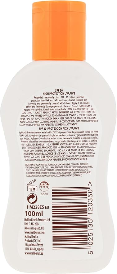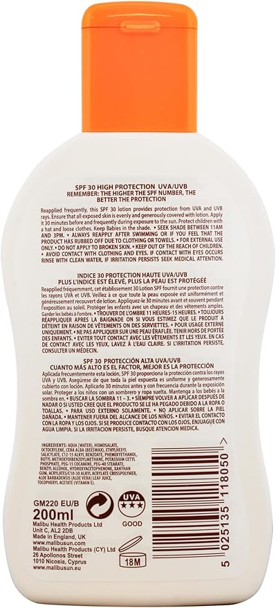 This sun lotion offers reliable SPF 30 protection for daily outdoor activities. Its non-greasy, fast-absorbing formula keeps skin moisturised and shielded from UV rays. Ideal for those seeking everyday sun care that feels light on the skin. Trusted by Malibu for consistent, effective sun protection.