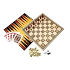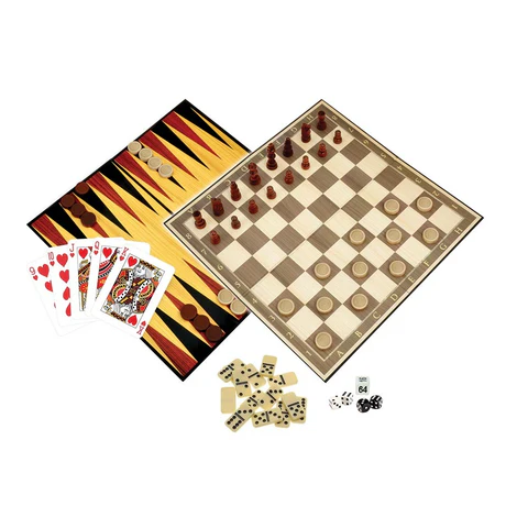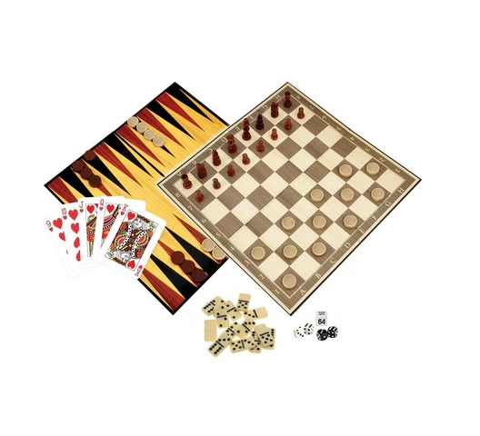 What's Included? | 62x Wooden playing pieces 1x Quad-fold playing board 28x Mini dominoes 4x Dice 1x Doubling cube 1x Deck of playing cards 1x Playing instructions |