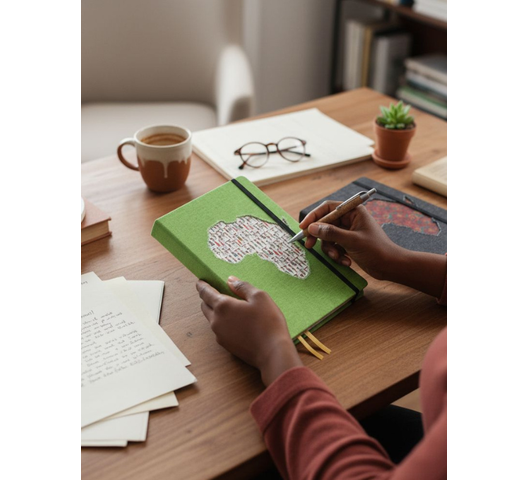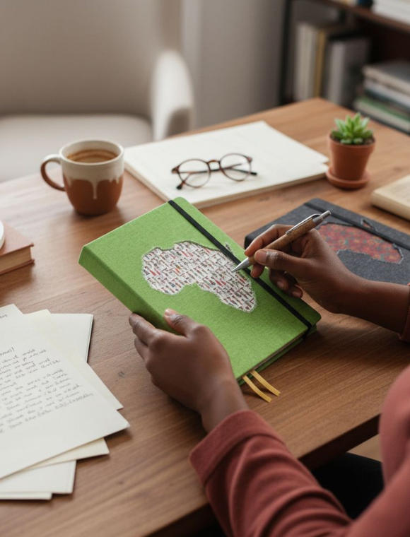 Premium leatherette A5 hard cover notebook with ruled pages on natural paper, with cork pen. The African Collection features vibrant designs inspired by African culture. The various editions are perfect for capturing your thoughts, ideas, and plans. The high-quality paper and durable cover ensure a great writing experience.