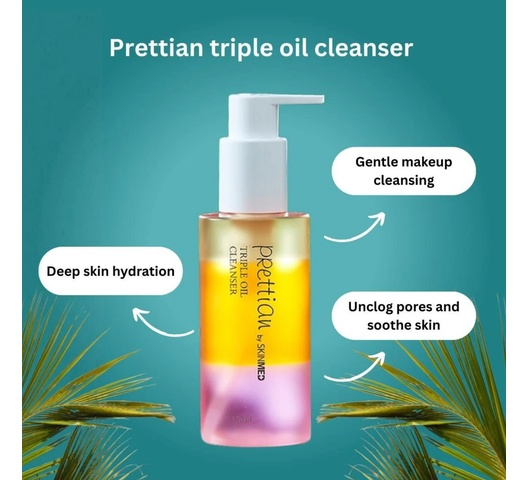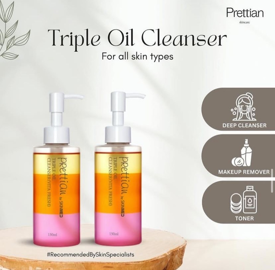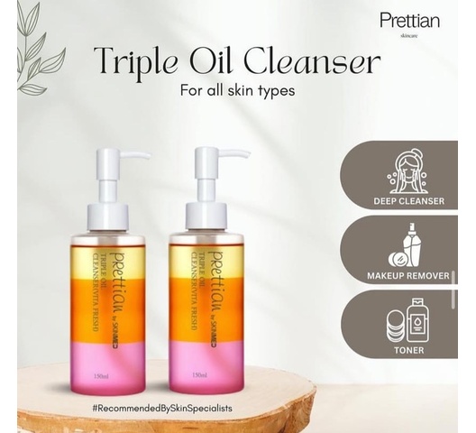 Prettian Triple Oil Cleanser is a 3-in-1 skincare solution that blends oil, essence, and water into a patented triple-phase formula. Designed for all skin types—including dry, sensitive, and combination skin—it offers a gentle yet effective cleansing experience. Available in two refreshing variants: VIT C (Vita Fresh Vitamin) and Aqua (Vita Fresh Aqua).