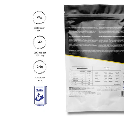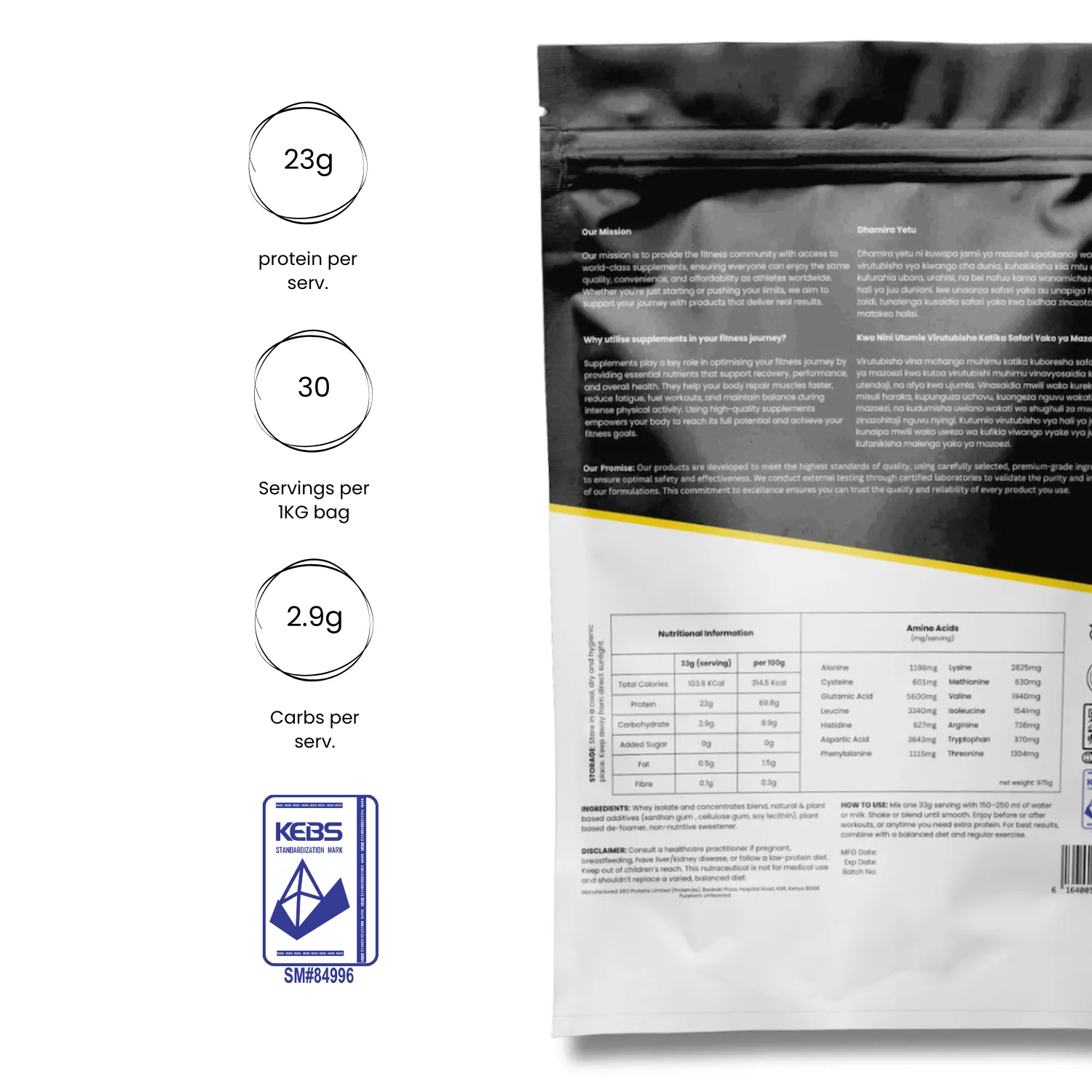 Protein.ke’s PureForm Whey Protein is a naturally formulated, performance-focused protein powder designed for clean, uncompromised nutrition. Each serving delivers 23g of high-quality protein with just 2.9g of carbs, supporting muscle growth, post-workout recovery, and overall wellness. What sets PureForm apart is its commitment to purity. Every ingredient is purpose-driven — from plant-based emulsifiers to organic flavourings where used — and completely free from sucralose or added sugars. No artificial additives. No shortcuts. Just wholesome nutrition, formulated with precision, backed by industry professionals, and fully KEBS certified. If you're seeking clean fuel to power your fitness journey, PureForm delivers everything your body needs — and nothing it doesn’t.
