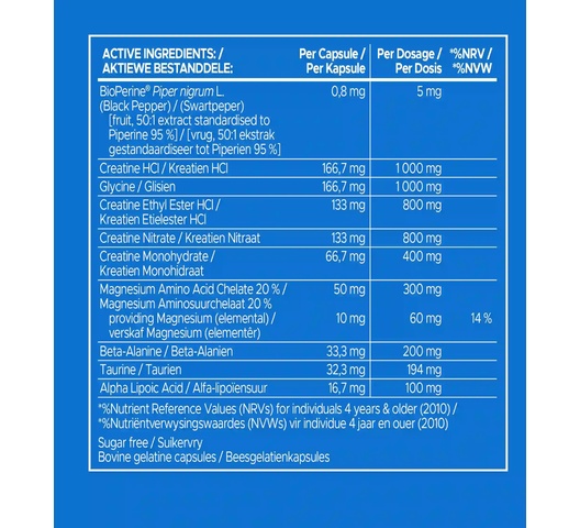 | Ingredients | A blend of four different compounds of creatine (Creatine HCl, creatine nitrate, creatine monohydrate, and creatine ethyl ester), Taurine, Magnesium chelate, Bioperine®, and Alpha-lipoic acid. |