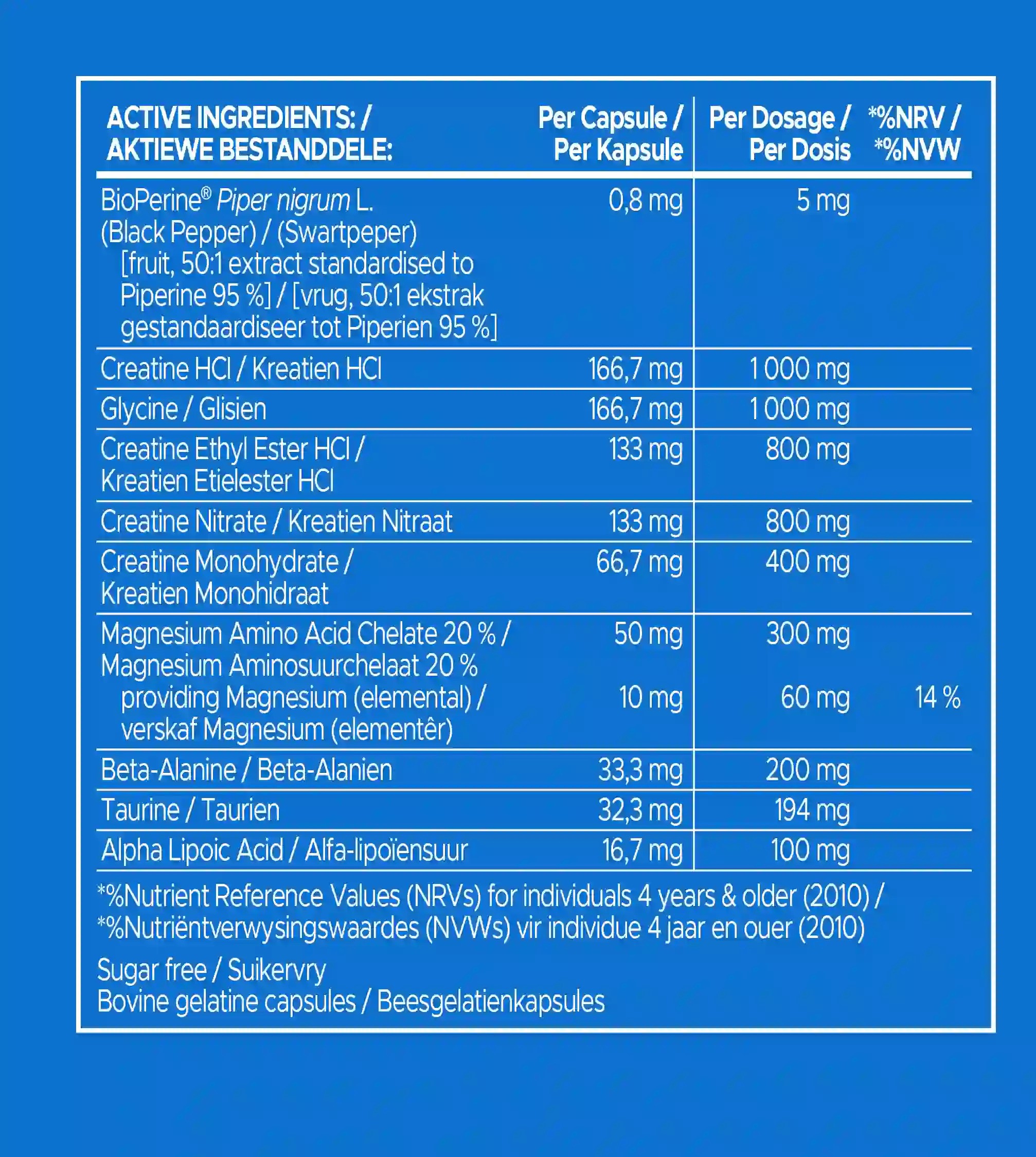 | Other Specifications | Delivers four different forms of creatine (including Creatine Ethyl Ester and Creatine Monohydrate) in a single capsule for multi-phase absorption. |