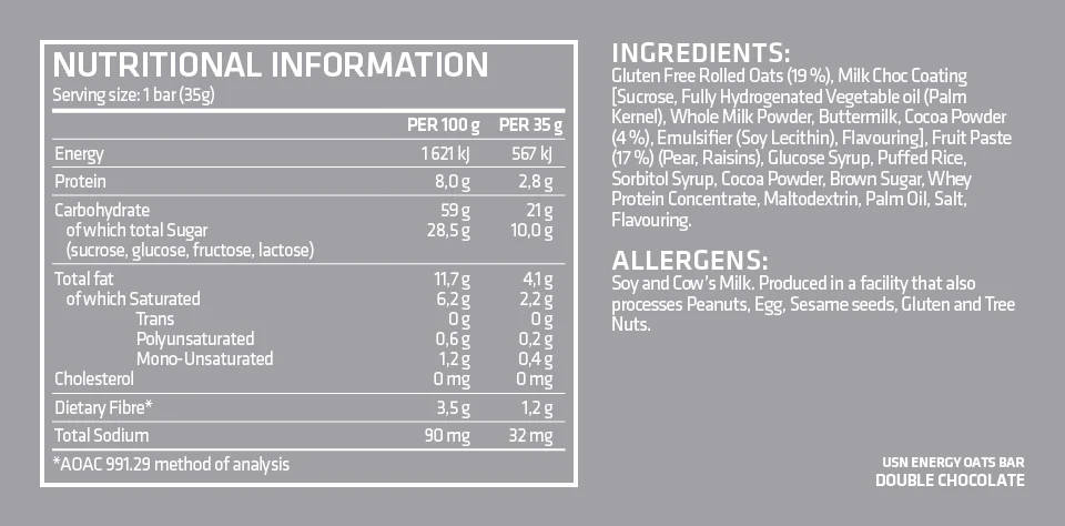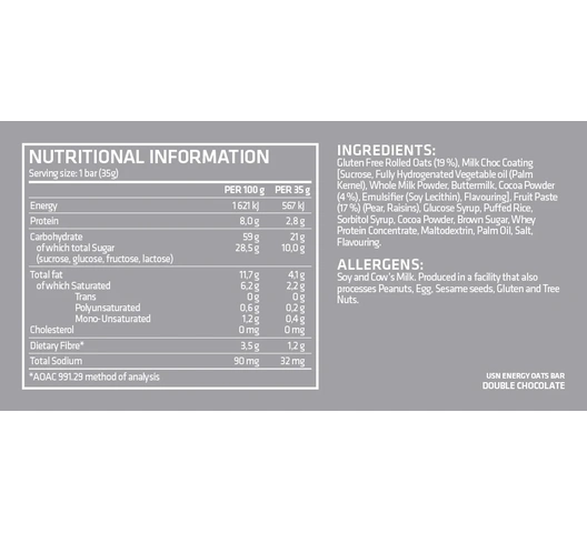 | What's included | 1 x Cardboard Display Box containing 20 individually wrapped 35 g Double Chocolate Energy Oats Bars. |