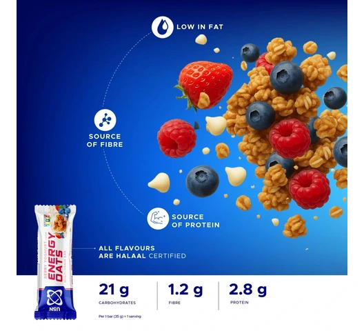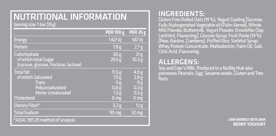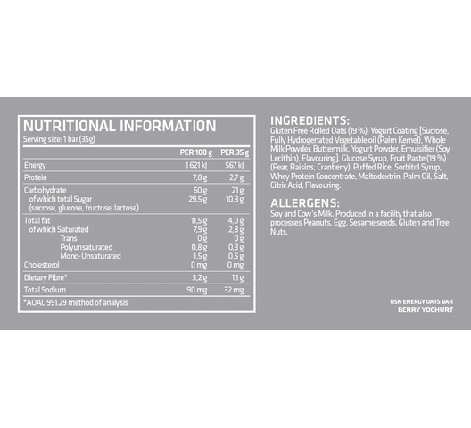 | What's included | 1 x Cardboard Display Box containing 20 individually wrapped 35 g Berry Yogurt Energy Oats Bars. |