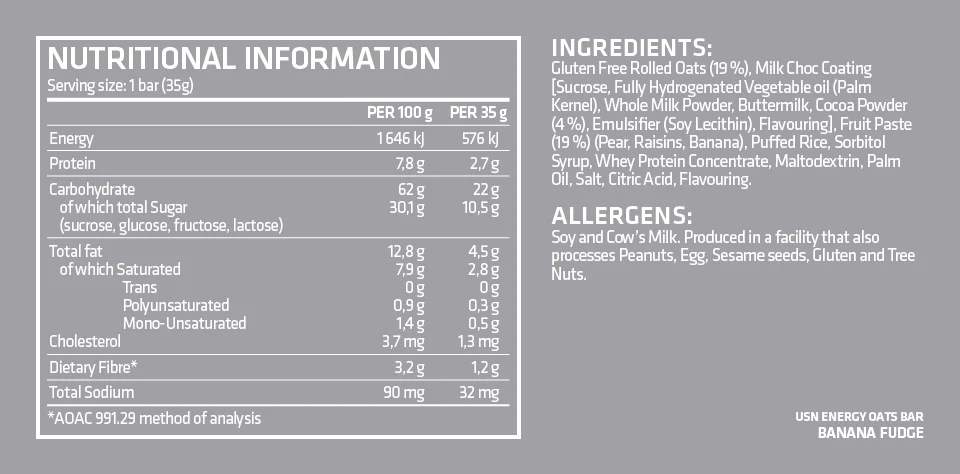 | What's included | 1 x Cardboard Display Box containing 20 individually wrapped 35 g Banana Fudge Energy Oats Bars. |