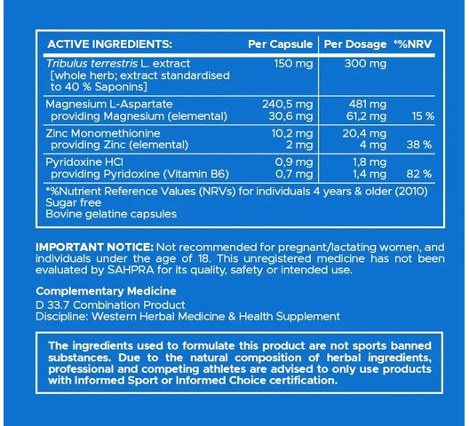 | Ingredients | Tribulus terrestris, ZMA®, Magnesium aspartate, and Vitamin B6. |