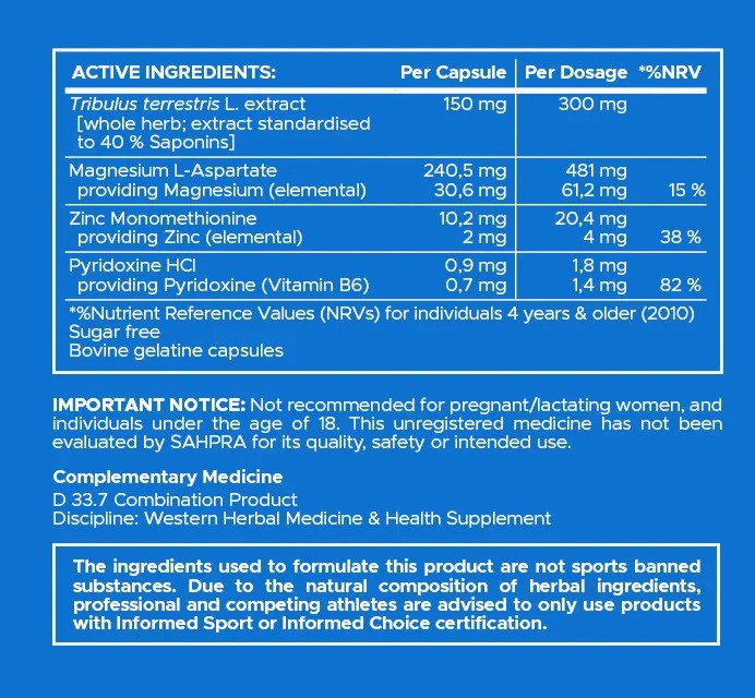 | Health & Safety Information | Contains active ingredients (Tribulus). Discontinue use if you experience any adverse reactions. |
