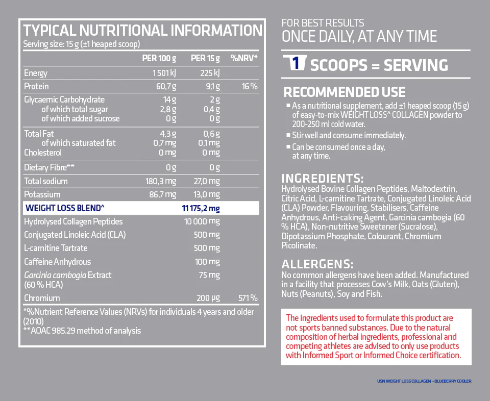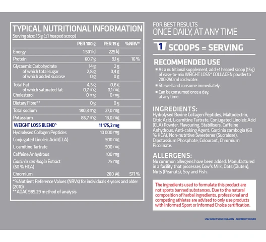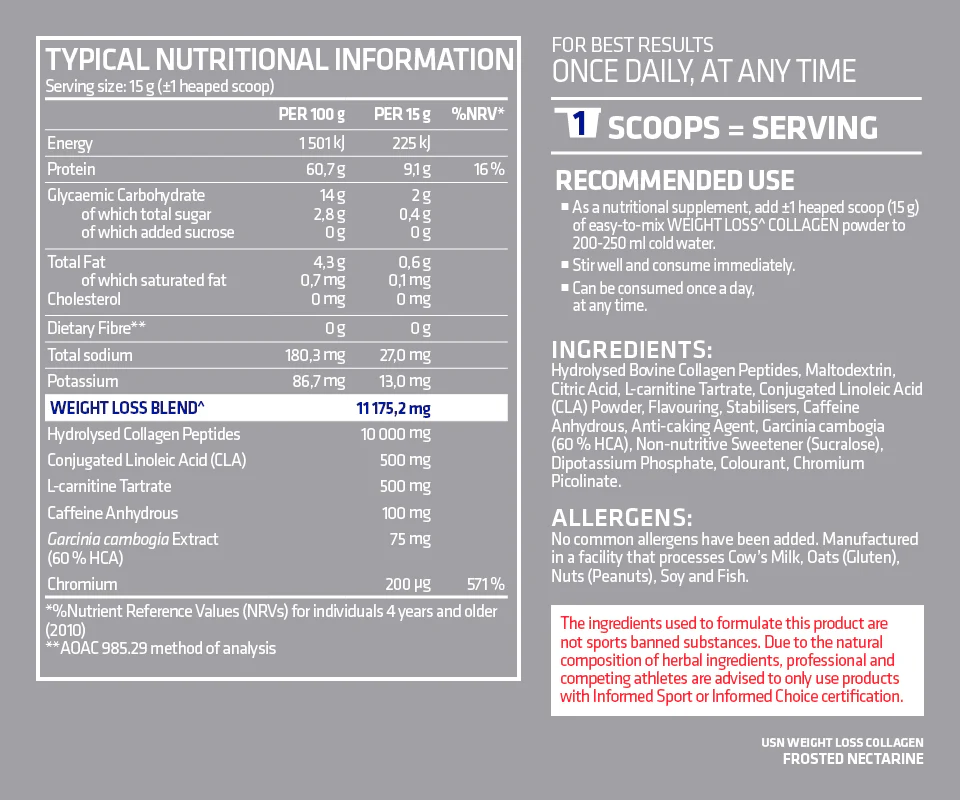 | Ingredients | Hydrolysed collagen peptides, Conjugated linoleic acid (CLA), L-carnitine tartrate, Garcinia cambogia extract, and Caffeine anhydrous (100 mg) |